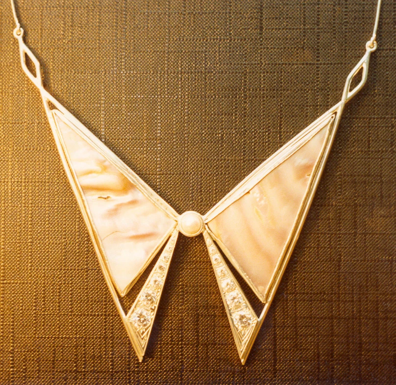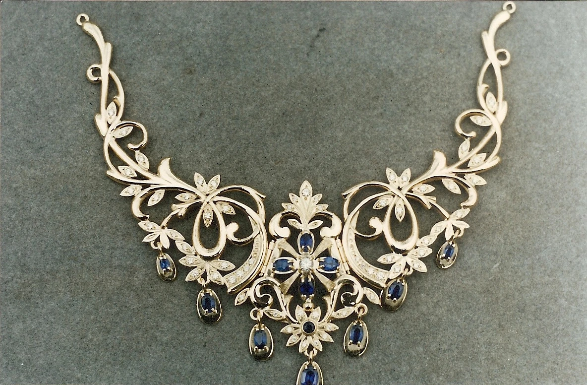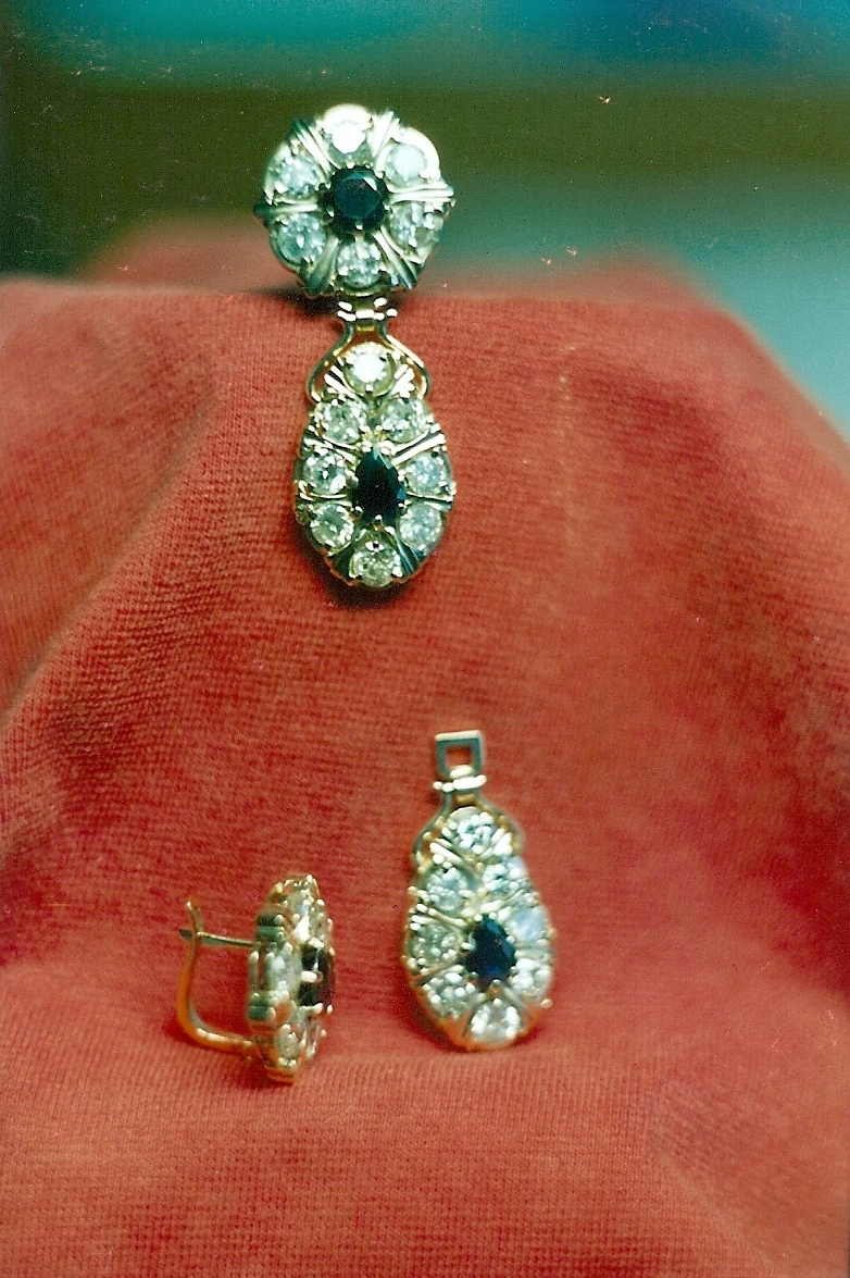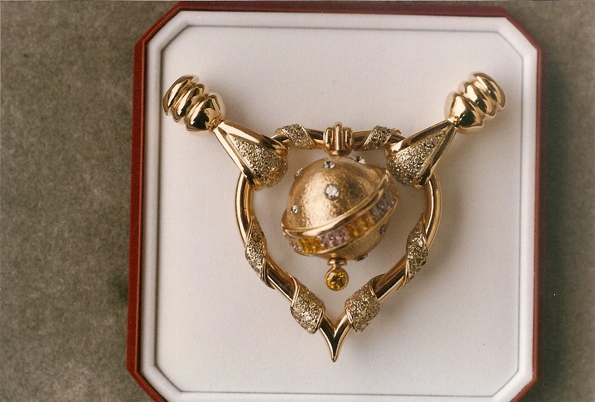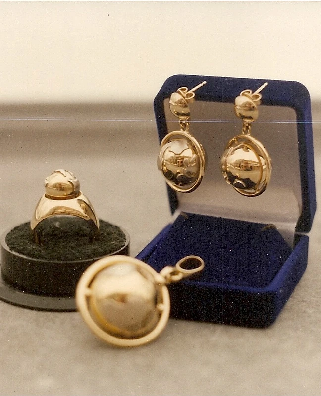 Na zdjęciu cały garnitur. Następna wersja była już z emalią na oceanach. Kula Ziemska obraca się swobodnie wokół osi przebiegającej ukośnie, tak jak na globusie. Projekt z katalogu klientki ale zmieniony. Zmiany to własny pomysł.