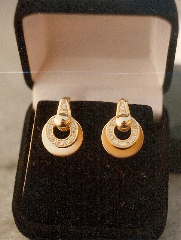 Złote kolczyki z ruchomymi elementami wysadzanymi białymi kamieniami. Pomysł katalogowy, ale zmieniony i rozbudowany, właśnie o te kolczyki.
