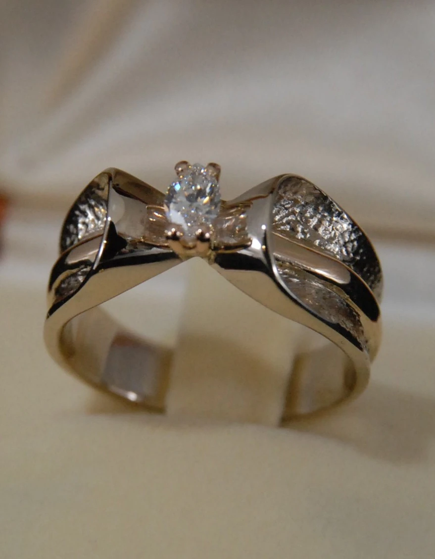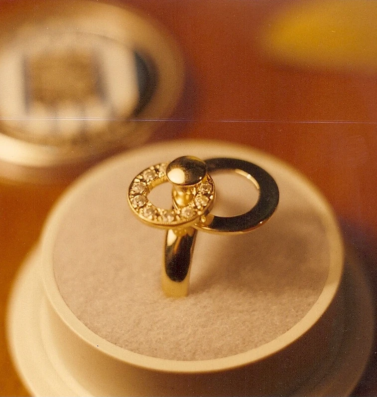 Złoty pierścionek z kamieniami. Pieścienie obracają się swobodnie do okoła widocznej osi.