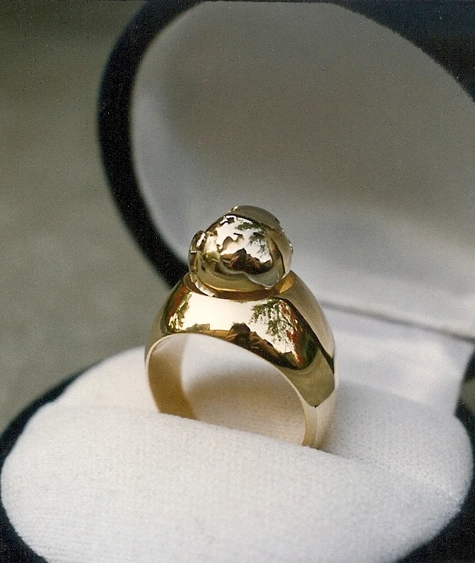 Wykonany z złota żółtego i białego. Pomysł z katalogu klientki ale zupełnie inaczej wykonany. Kula Ziemska obraca się swobodnie wokół osi przebiegającej pod kątem podobnie jak na globusie.