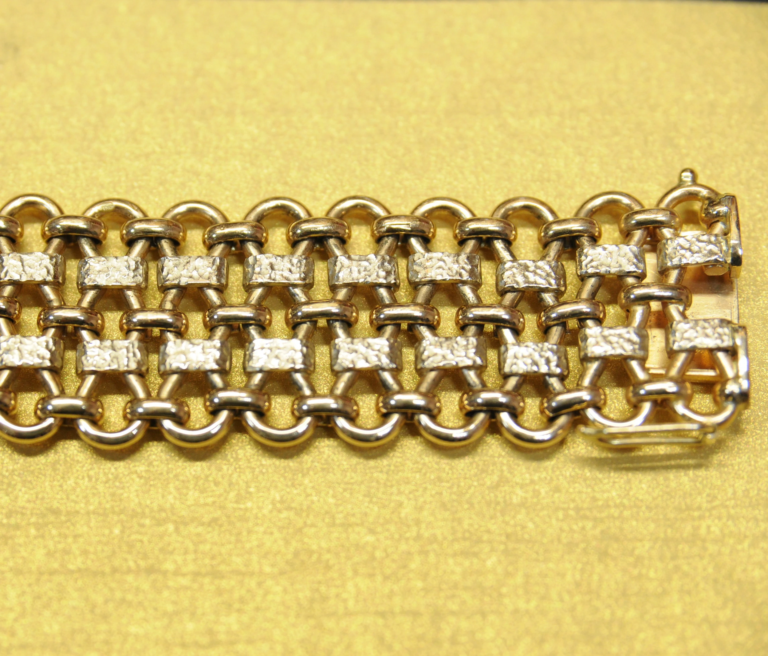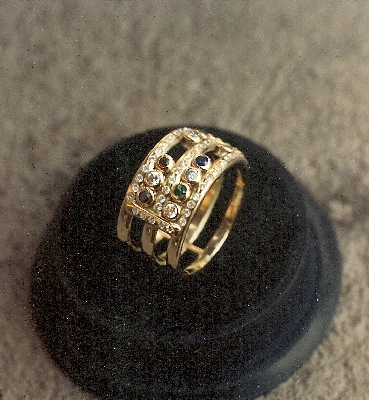 Pierścionek złoto i kamienie. Pomysł z katalogu klientki, też zmieniony. Widoczne między szynami oprawki, przesuwają się swobodnie między innymi podczas ruchu ręki. I nie wylatują. Pierścionek jest kopią bransolety z kompletu.