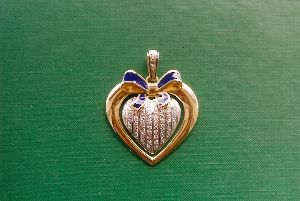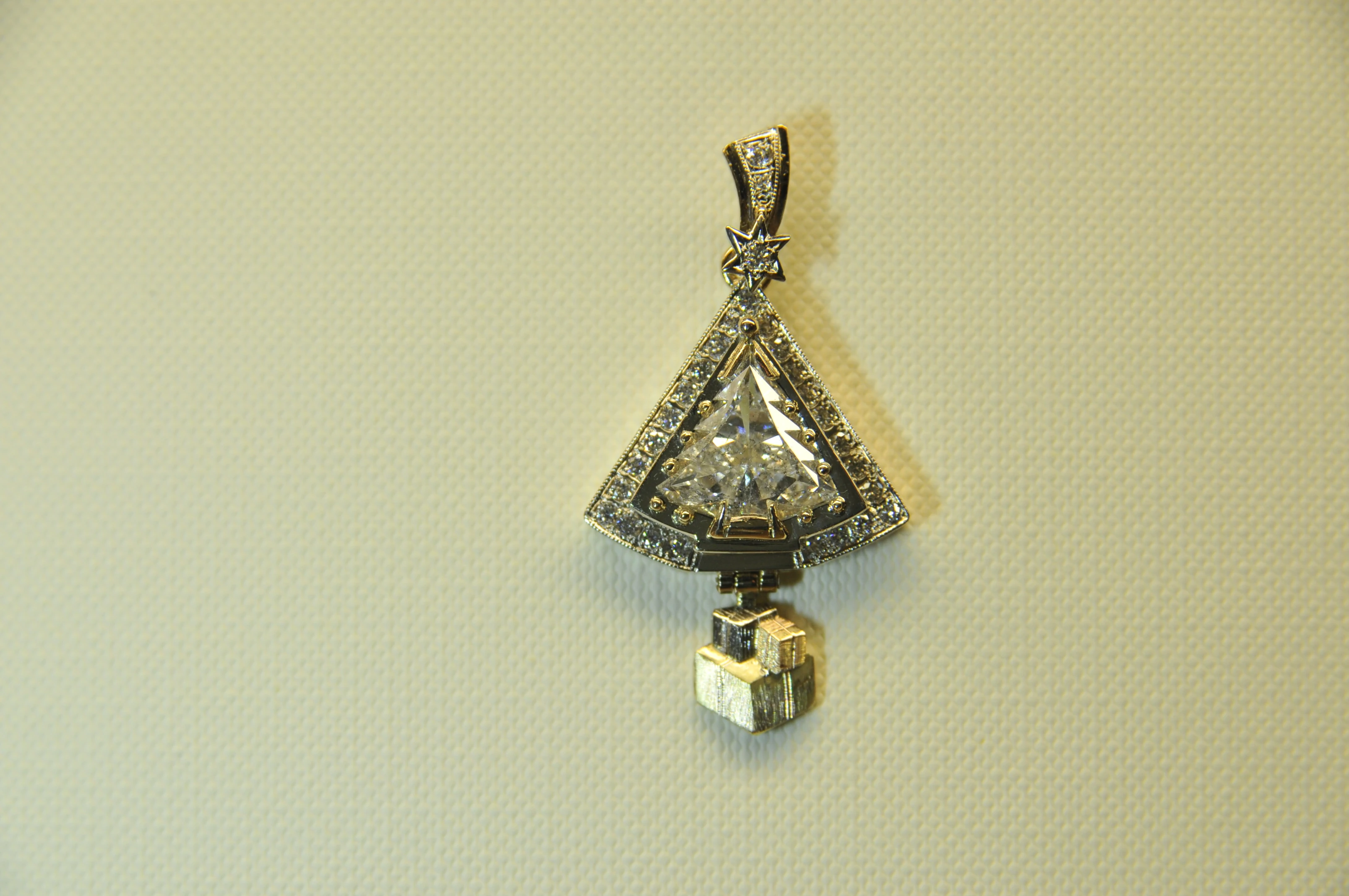 Wisior z diamentem w kształcie choinki, oraz brylantami, złoto białe i żółte.Projekt własny.