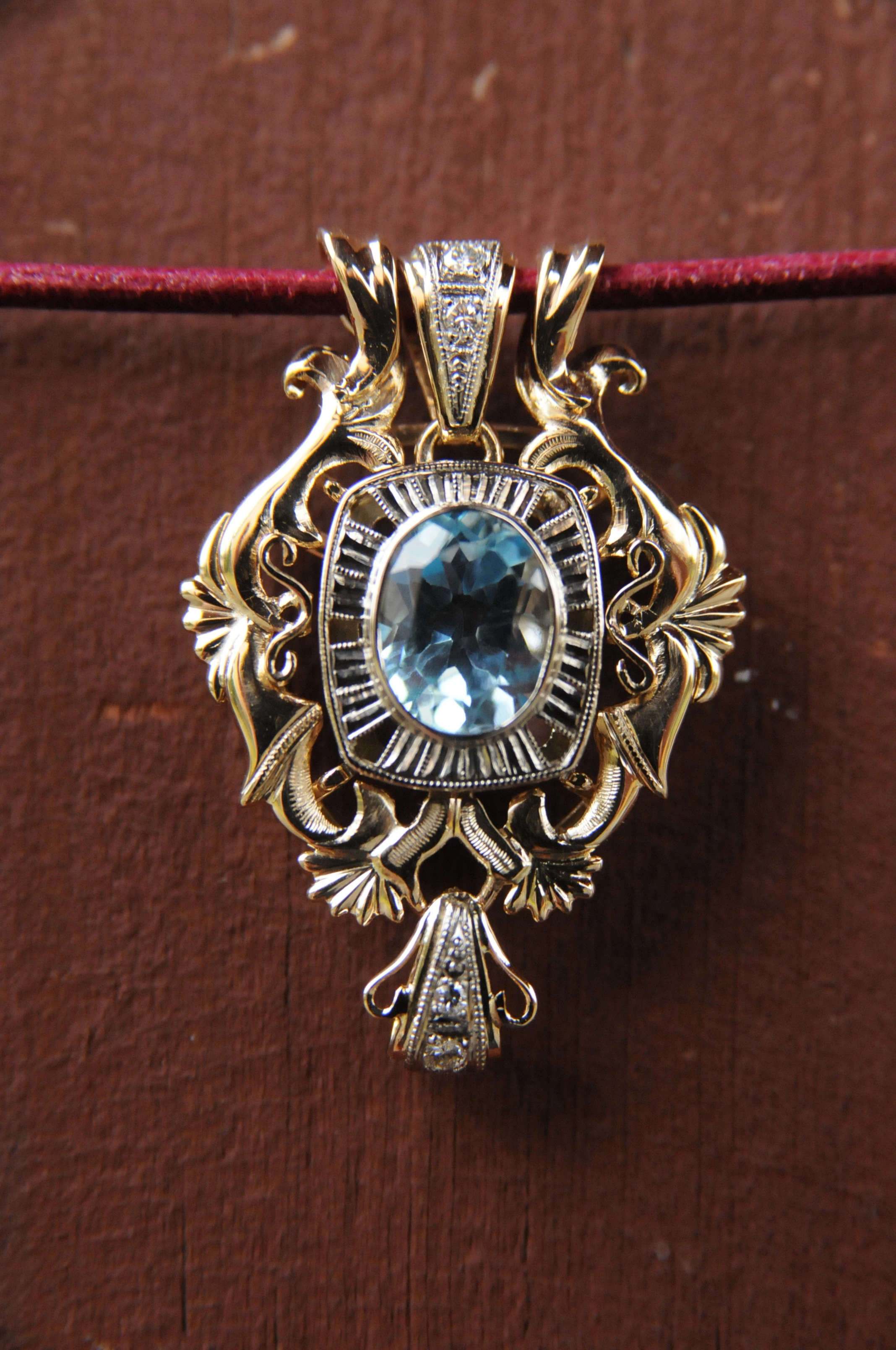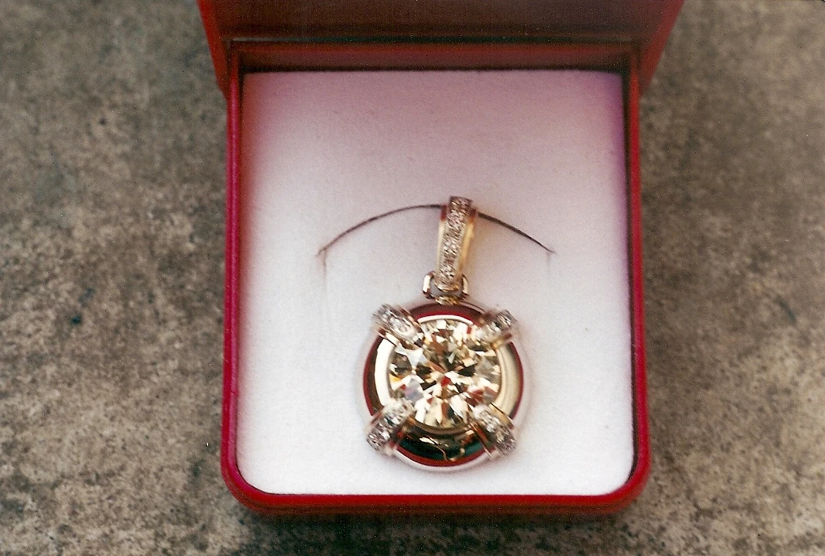 Centralny element można wyciągnąć, by uzyskać skromniejszy wisior. Wykonany z żółtego i białego złota z kamieniami.