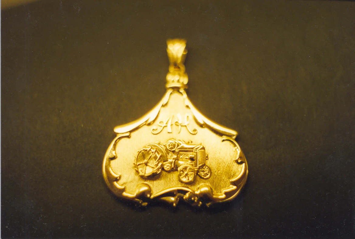 Złoty wisior wykorzystyjący motoryzacyjny motyw, czyli zabytkowy traktor. Projekt własny na podstawie moich zdjęć oryginalnego traktora.