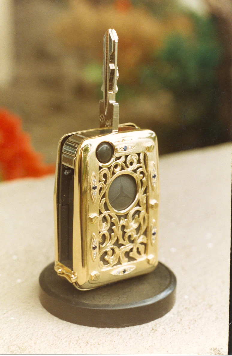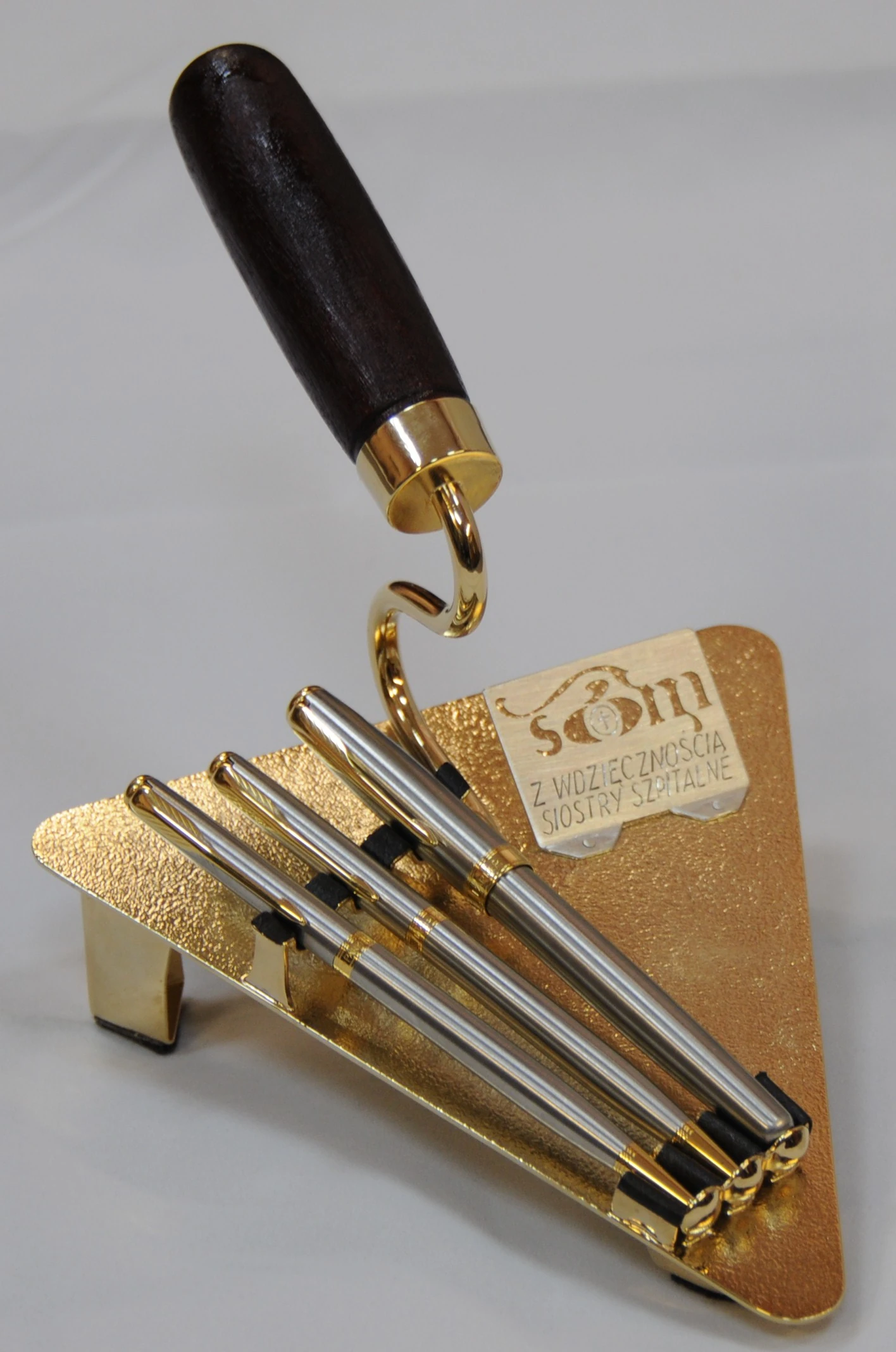 Złocony mosiądz, drewno i markowe przybory do pisania. Projekt wykonania własny, ale pomysł zleceniodawcy.