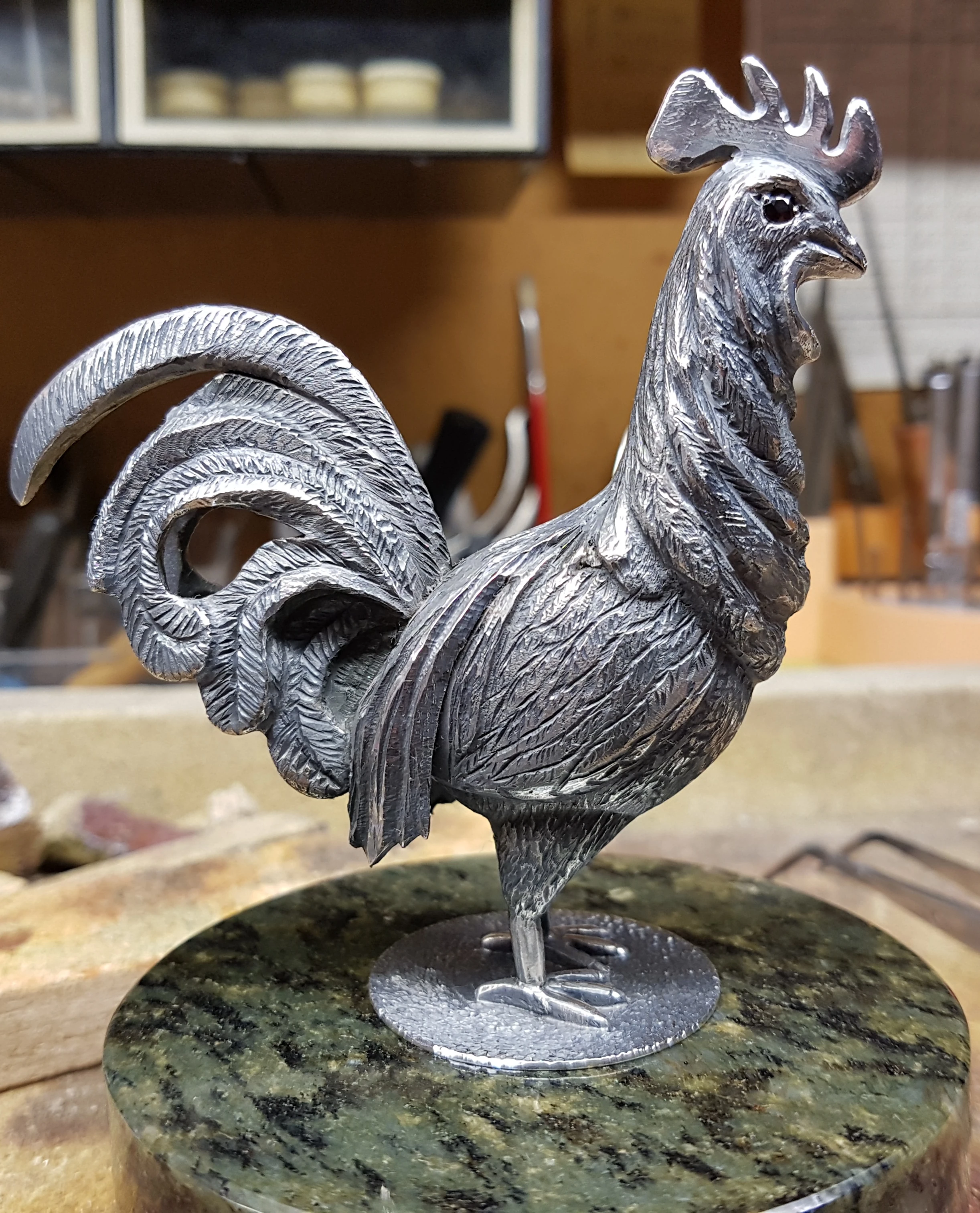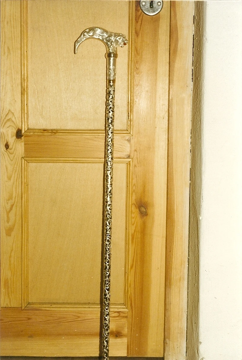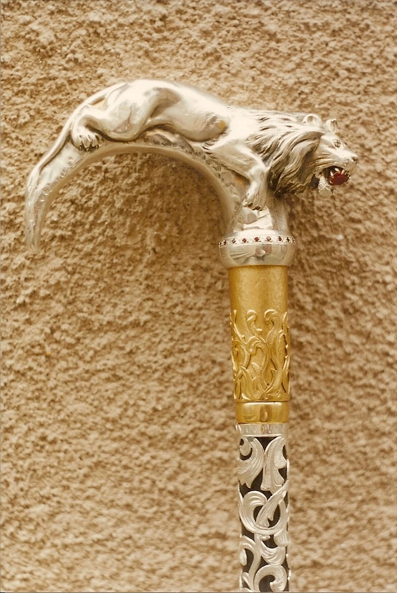 Laska została wykonana ze srebra z dodatkami złota i złoceniami, wnętrze to kij mahoniowy. Lew przyniesiony przez zleceniodawcę po naprawie połączony z wykonaną przeze mnie oprawą kija laski. Projekt własny.