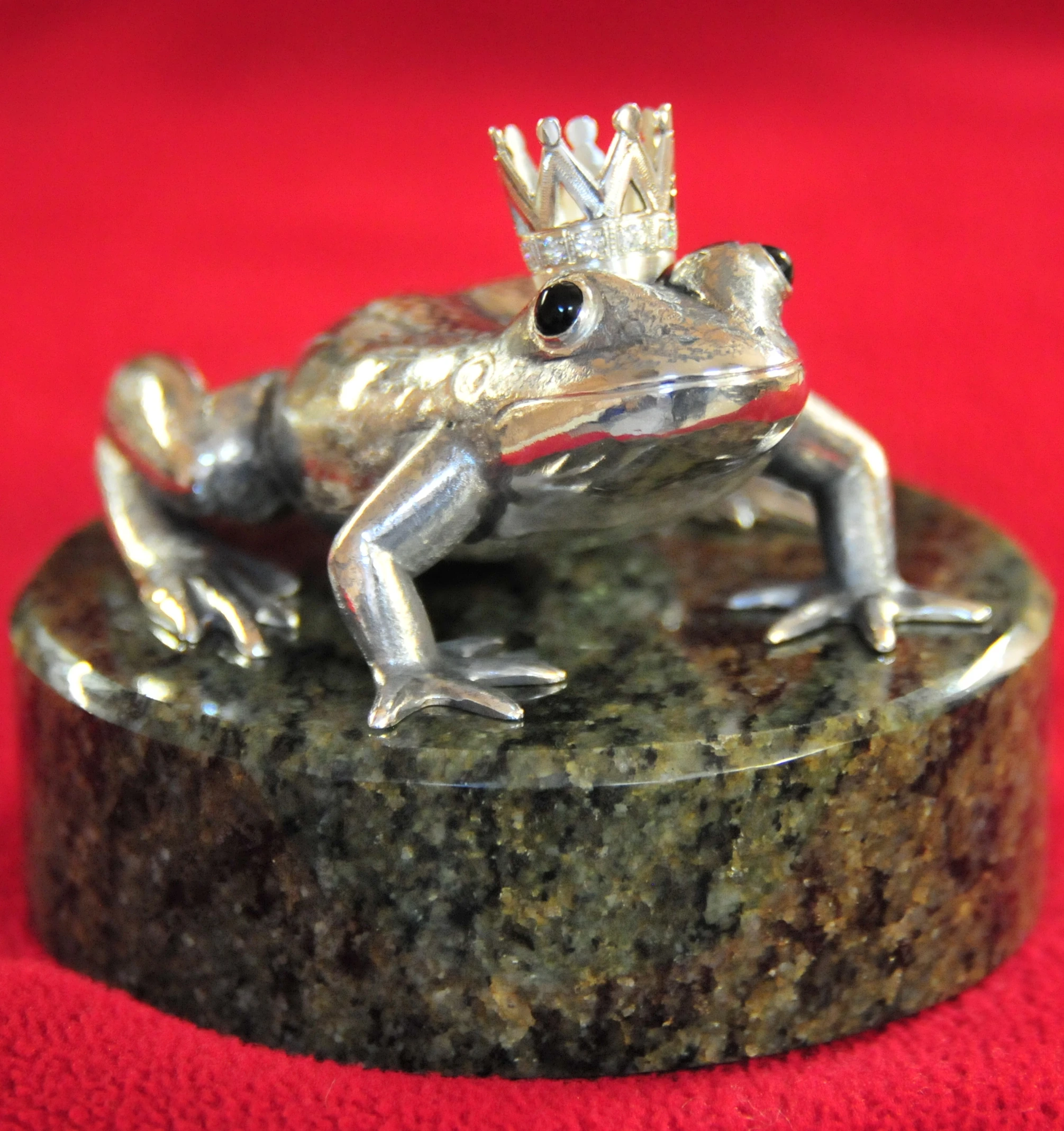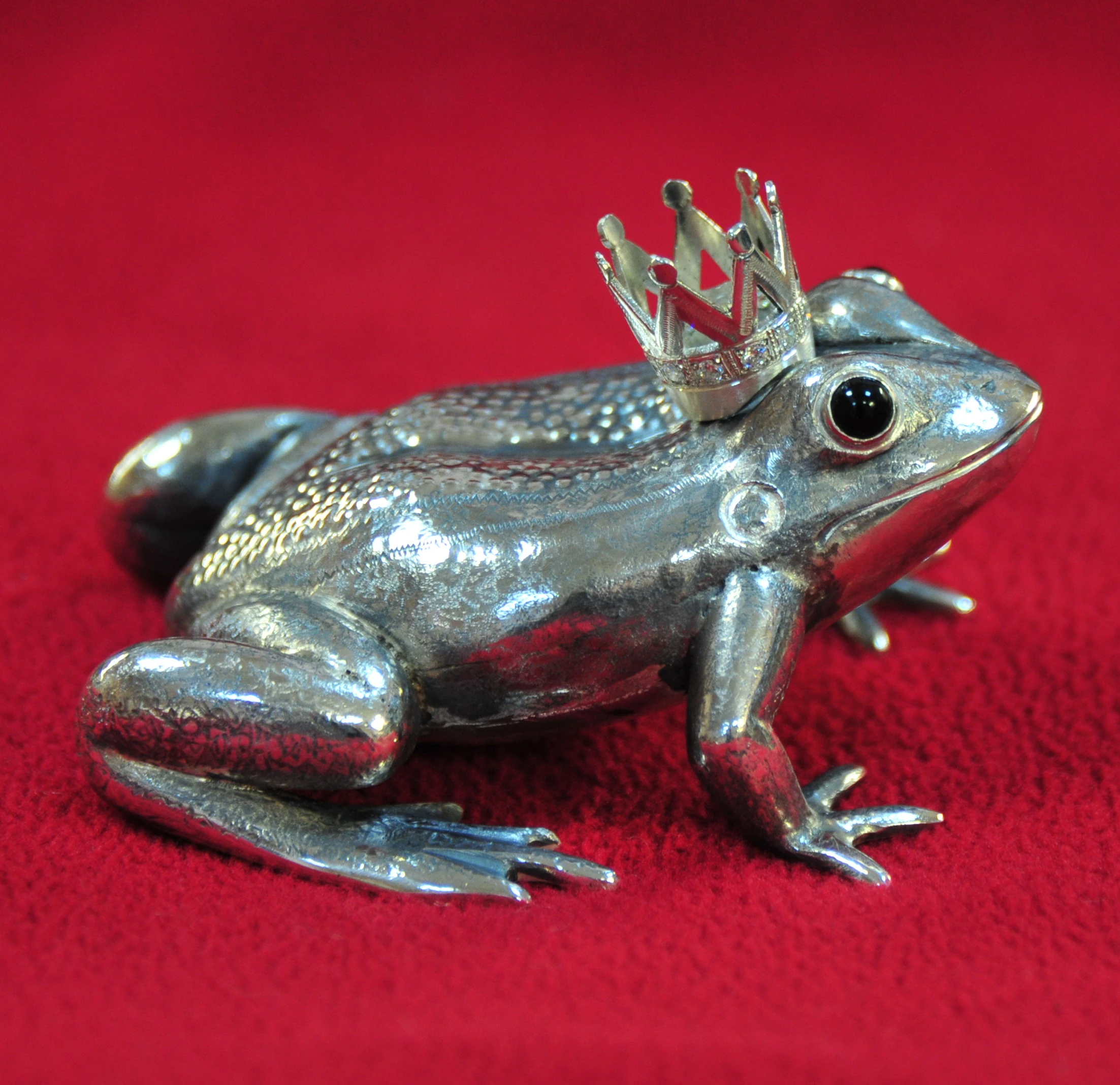 To nie żaba, to Książę. Srebro, kamienie. Korona była później pozłocona. Korpus wykonany z blachy. Korona jest ruchoma, na wypadek awarii. Całość wykonana ręcznie. Projekt własny oparty na naturalnym modelu. Model nie jest w środku!!! Mieszka nadal nad jeziorem.