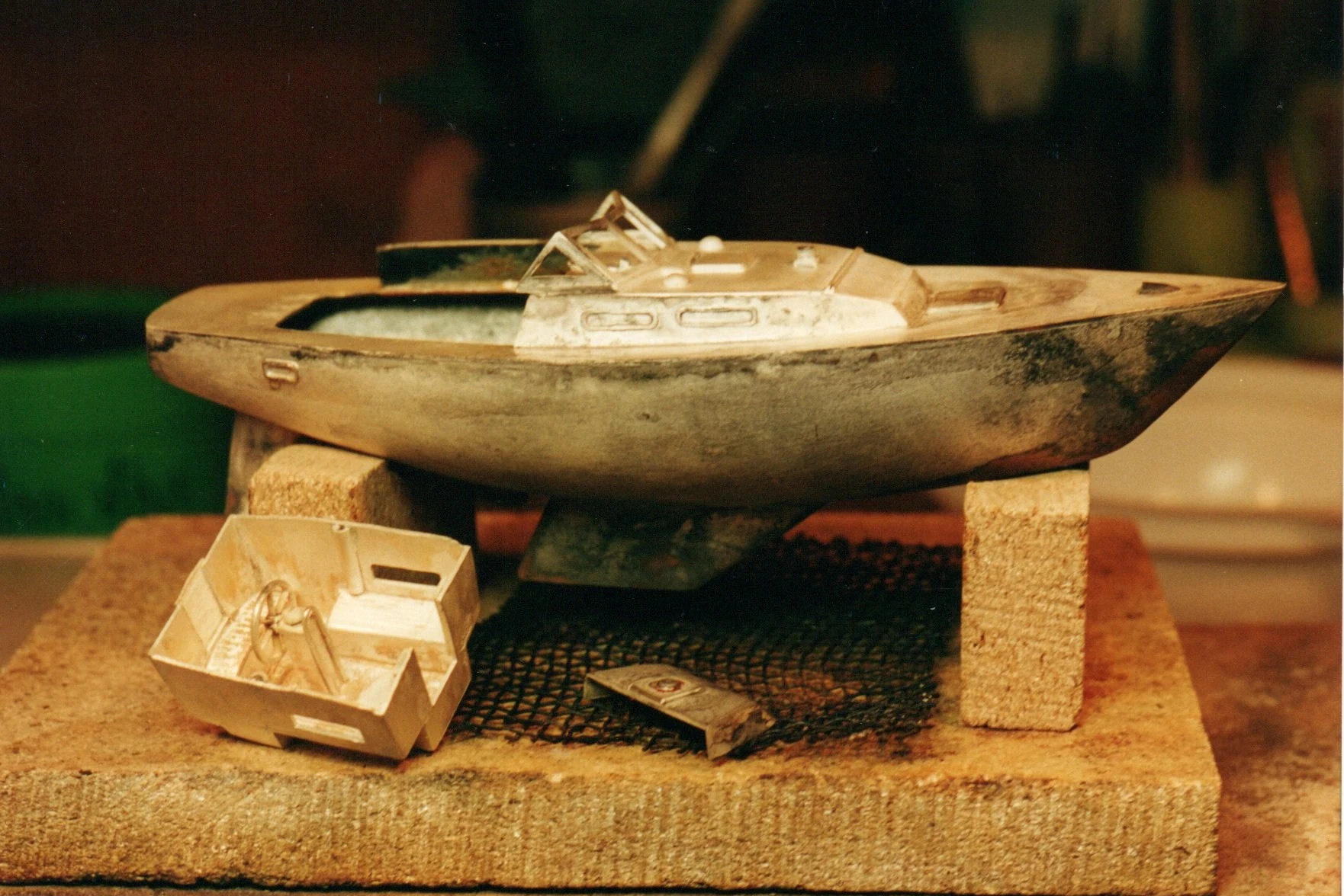 Całość ze srebra, kadłub jachtu wykonany z jednego arkusza blachy w jednym kawałku.
