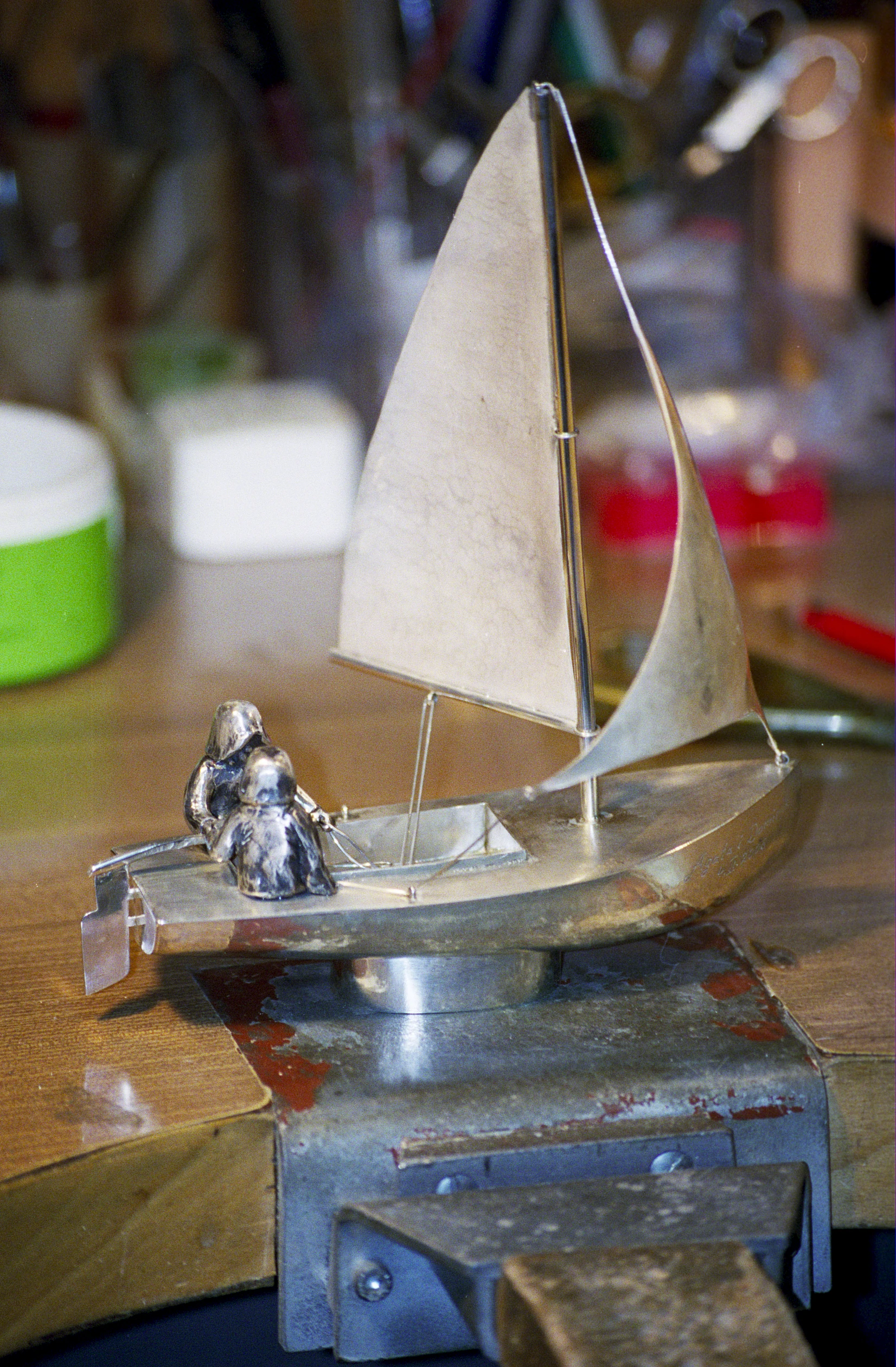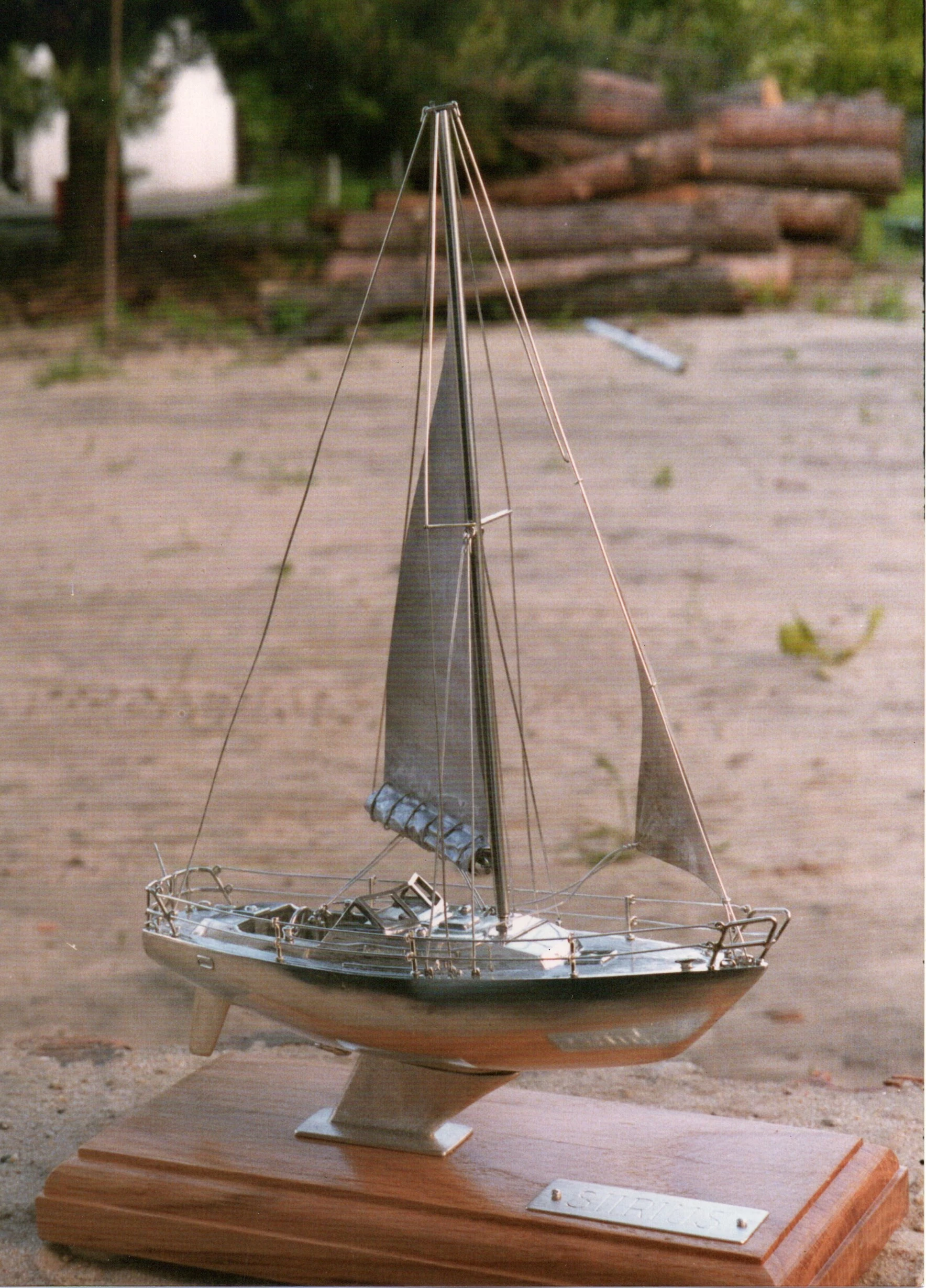 Jacht morski wykonany z srebra, wiernie odtworzony model oryginalnego Fińskiego jachtu. Luźno wkładany do kieszeni, imitującej kil. Można wyciągać go z podstawy.