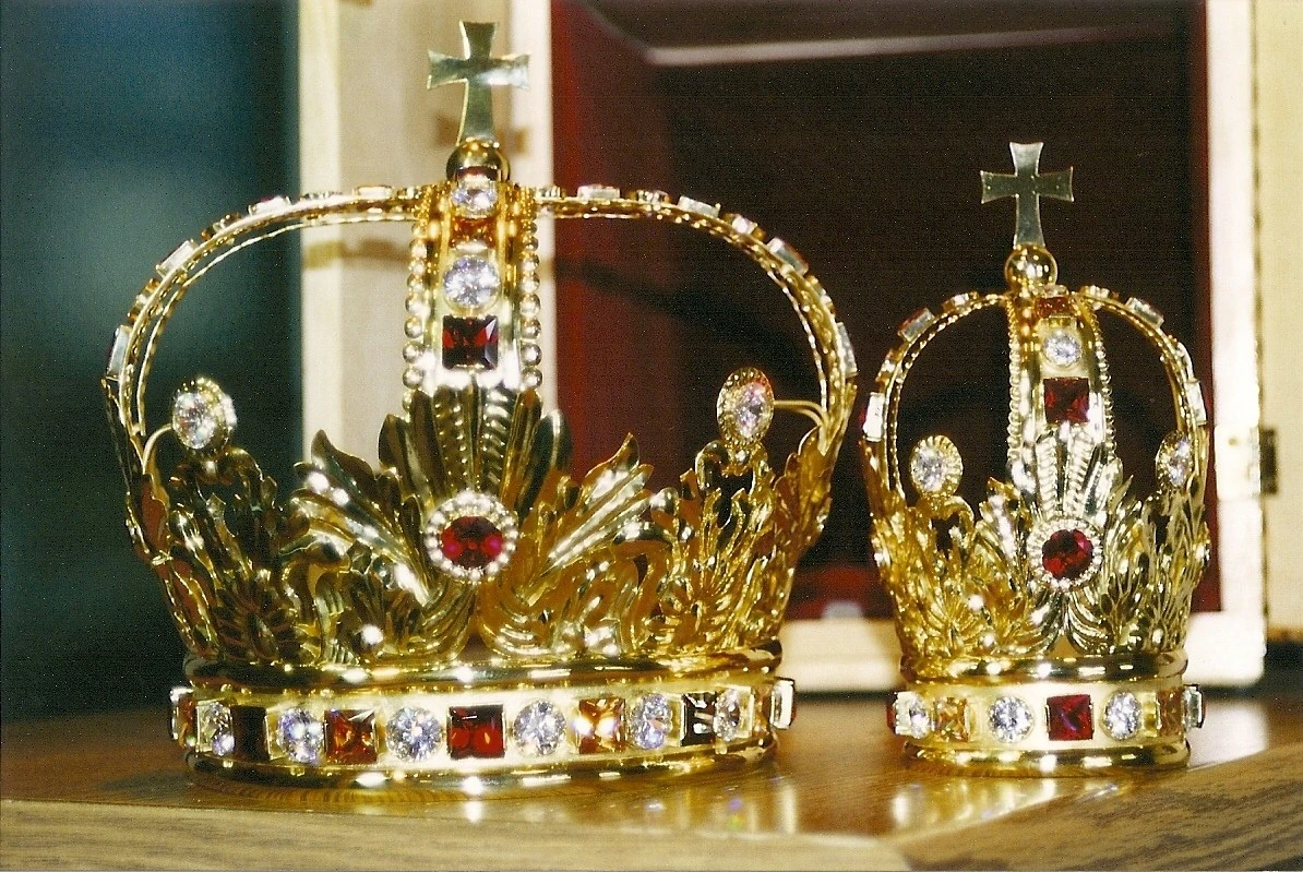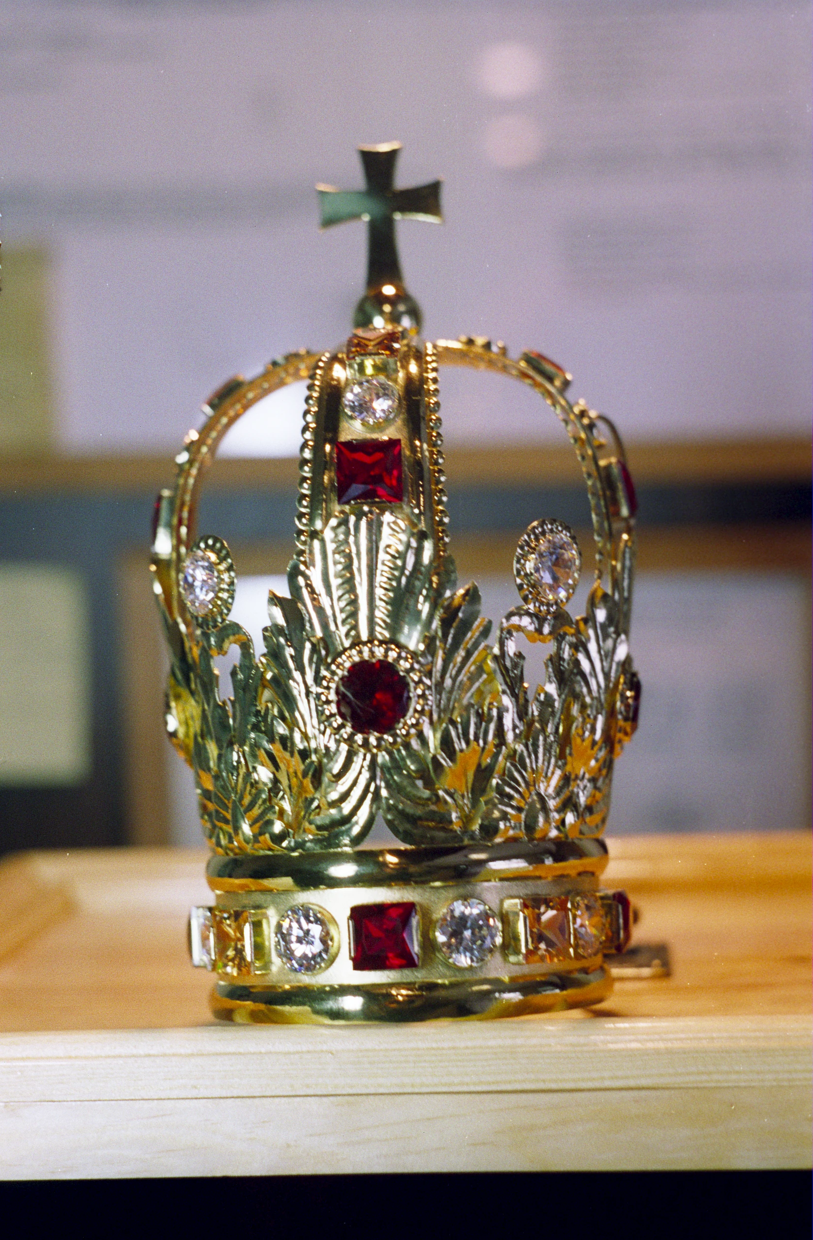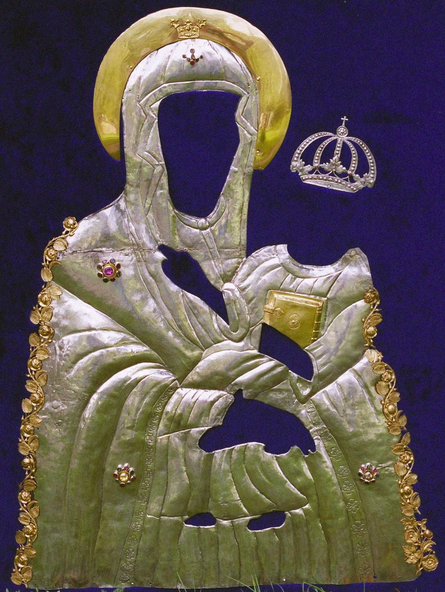 Korony na figurę Matki Bożej Ucieczki Grzeszników. Figura drewniana z Dzieciątkiem Jezus.