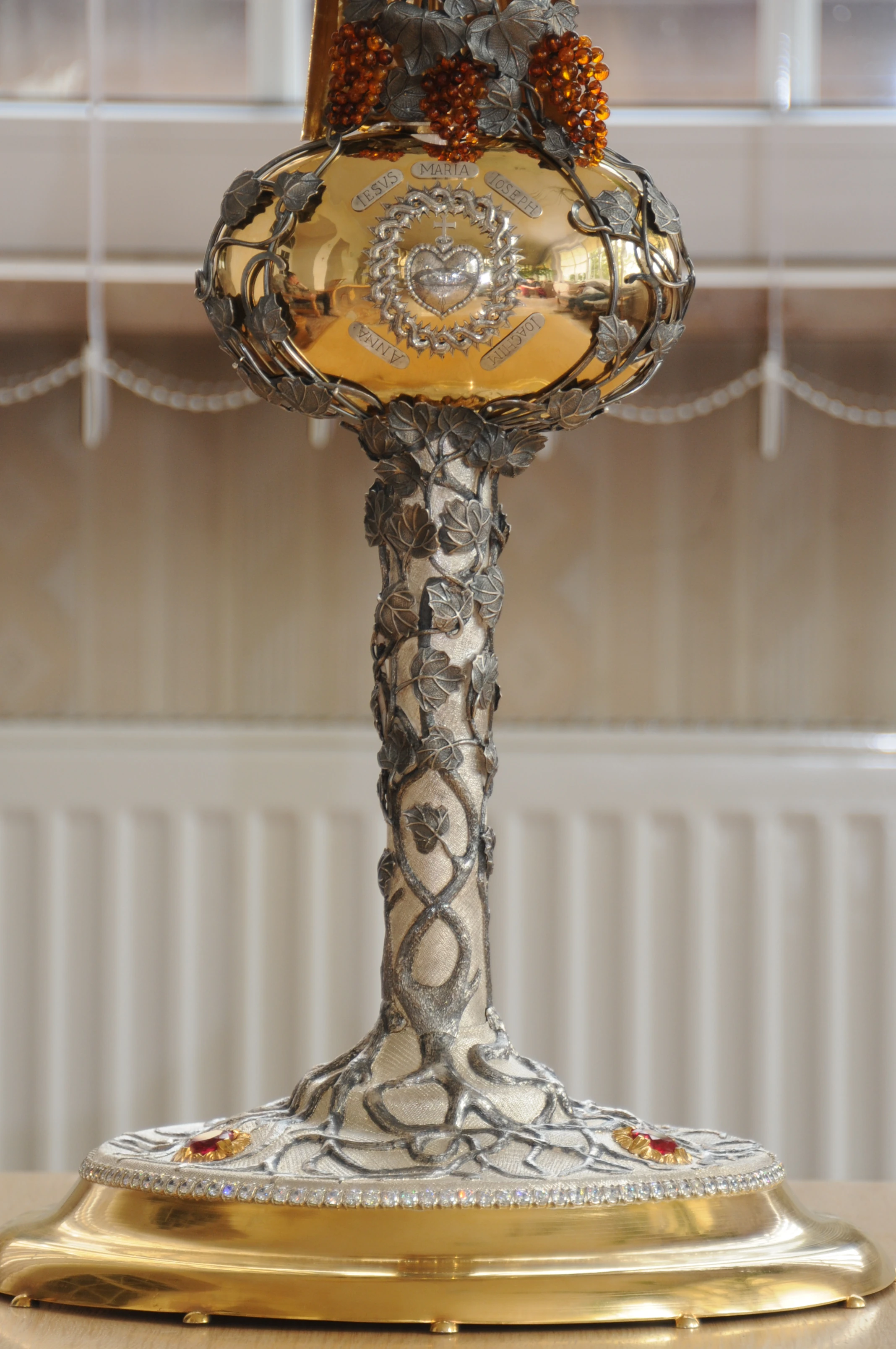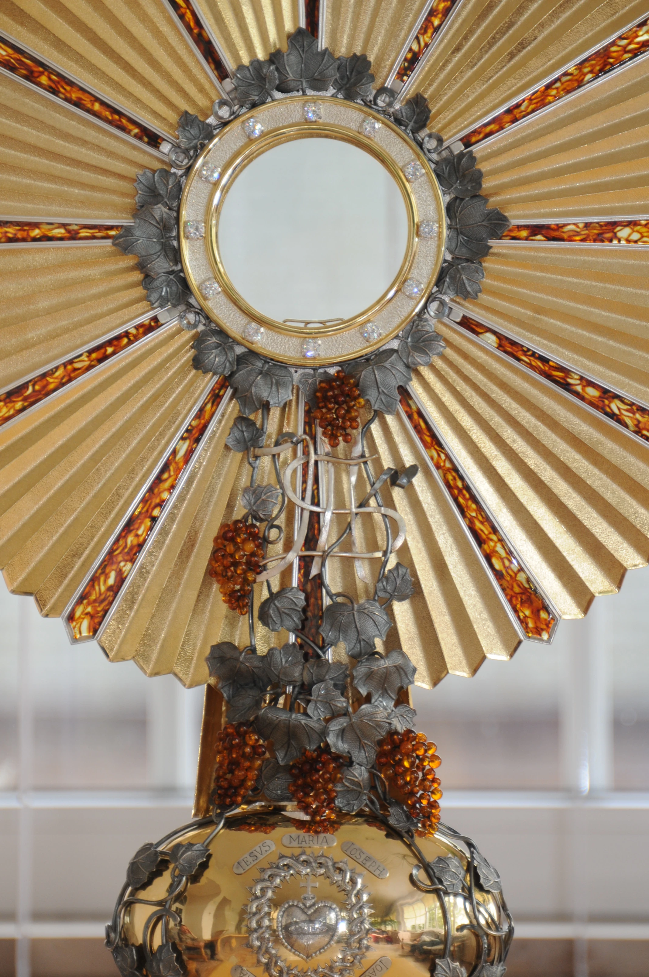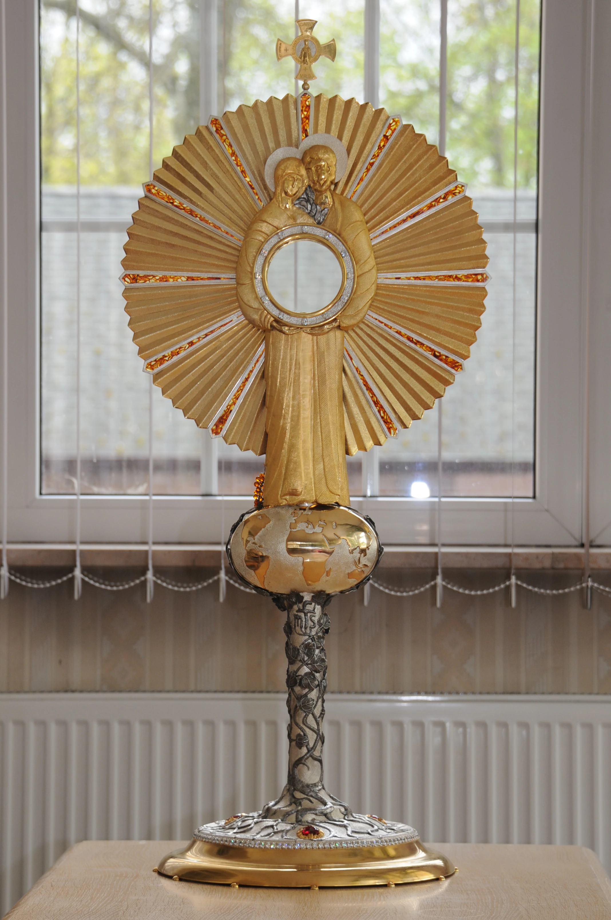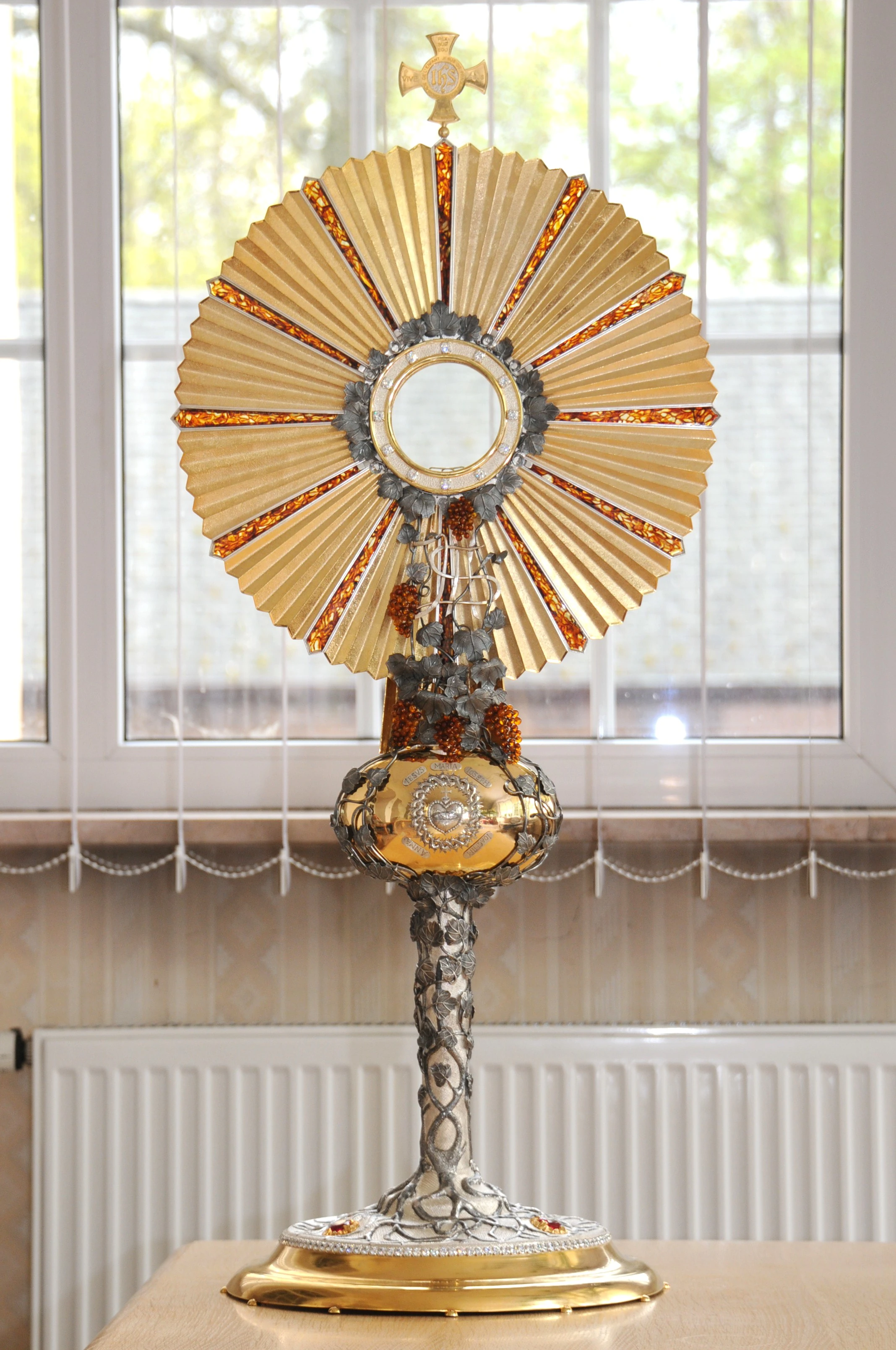Podstawa wykonana na wyoblarce, wzorcowe liście skopiowane w odlewarce. Cała reszta ręcznie... . Wysokość monstrancji 103 cm.